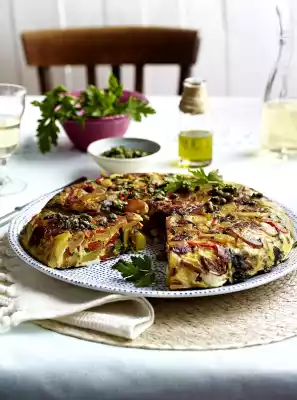 Wash the parsley, shake dry. Chop coarsely with the capers. Mix with 2-3 tablespoons of oil, season with salt and pepper. Remove the tortilla from the oven and let it rest in the pan for about 5 minutes. Turn out, sprinkle with parsley-capers mixture.