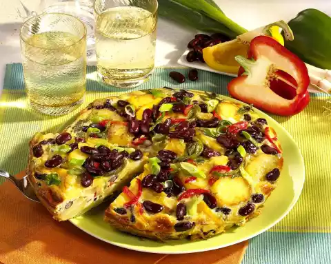 Clean, wash and cut the spring onions into rings. Peppers clean, wash and cut into fine strips. Pour the beans onto a sieve, rinse and drain. Add spring onions, bell peppers and beans to the potatoes, season with salt and pepper and fry for another 5 minutes.