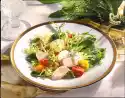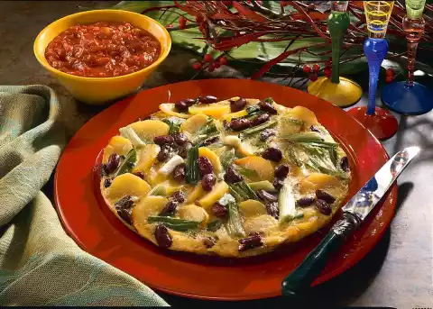 Sauté the vegetables and potatoes while turning. Whisk eggs and milk. Season with salt and pepper and pour over the vegetables. Cover the vegetables and let them simmer at low heat for 15-20 minutes. In the meantime, peel and finely dice the onion and garlic for the sauce.