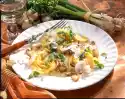 Clean, wash and cut the spring onions into rings. Drain the beans in a sieve. Peel and wash the potatoes and cut them into fine slices. Heat oil in a coated pan.