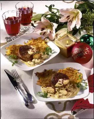 Dab steaks dry and wrap with bacon. Tie with kitchen string. Fry steaks in 1 tbsp. hot oil at medium heat for approx. 8 minutes. Turn from time to time