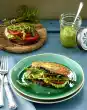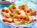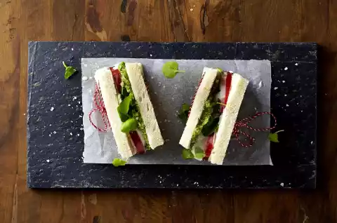 Spread 6 slices of bread with cream cheese. Spread the remaining slices of bread with the pesto. Arrange tomatoes and mozzarella on the cream cheese toast slices. Place the pesto toast slices on top. Halve the toast slices and tie them together with kitchen string.