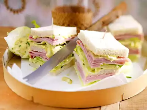 Clean and wash the lettuce, possibly halve it and remove the leaves from the head individually. Press 24 leaves flat. Set aside 4 smaller leaves as "bowls" for serving. Use the remaining lettuce for other purposes. Spread 1/2 tbsp. apple cream on 8 toast slices, cover with 1/8 of the ham and 3 salad leaves each