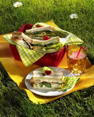 Cover 2 slices of bread with rocket and mortadella. Cover 2 slices of bread with salad, cheese and cucumber. Cut cress from the bed and spread on the cucumbers. Cover with the remaining slices, halve each one.