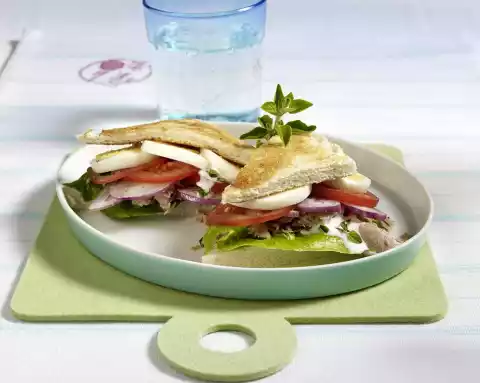 Spread the tuna, onion rings and tomato on top and cover with egg slices. Cover with the rest of the bread and press down lightly. Cut bread diagonally in half, arrange and garnish with oregano.
