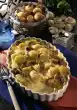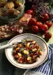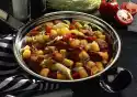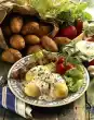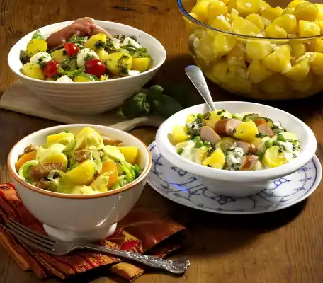 Wash the potatoes and cook in boiling water for about 20 minutes. Peel and finely dice onions. Drain potatoes, rinse, peel and halve. Boil up broth and onions. Add vinegar and oil, pour over the potatoes and leave to soak for about 30 minutes. Cut potatoes and marinade in thirds