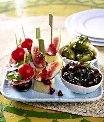 Wash the figs, dab dry and cut each into 4 slices. Cut cheese into 8 cubes. Skewer 1 fig column each onto a cheese cube with a wooden skewer. Put some cranberries on each fig. Arrange everything on a plate