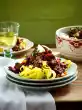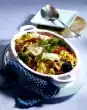 Onions peel and roughly chop. Wash the herbs, shake dry, put some oregano aside for garnishing. Heat the oil in a large pan and fry the minced meat until crumbly. Add onions and fry for 1-2 minutes.