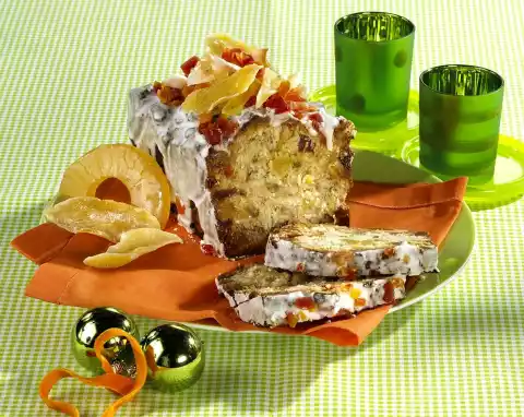 If necessary, cover the fruit bread after half the baking time. Then remove from the oven, place on a rack and let it cool down. Turn out of the tin and remove the baking paper. Sieve icing sugar into a bowl for the icing. Add 1-2 tablespoons lemon juice and 2-3 tablespoons rum and mix well. Spread the icing evenly over the fruit bread and decorate with dried or candied tropical fruits (e.g. bananas, melon, papaya, pineapple etc.)