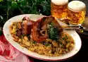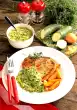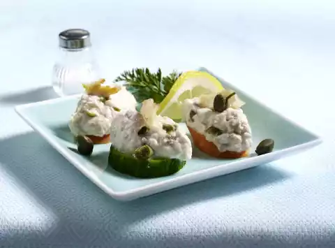 Mash fish roughly with a fork. Capers, up to 3 for garnishing, chop coarsely. Mix capers, fish and cream cheese, season to taste with salt and pepper. Arrange trout cream on the cucumber and carrot slices, garnish with remaining capers, dill and lemon slice.