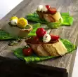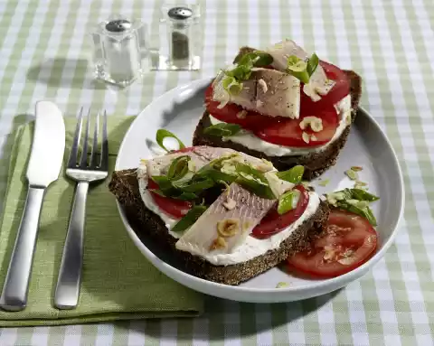 Mix quark with horseradish, season with salt and pepper. Spread bread with quark. Spread tomatoes, trout fillet and spring onions on it. Sprinkle with nut leaves and season with pepper.