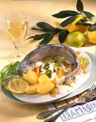 Trout wash. Bring white wine, 2 litres of water, vinegar with bay leaf, peppercorns, approx. 1 teaspoon of salt to the boil and leave the trout to simmer for approx. 10 minutes. Do not let it boil any more! In the meantime, heat the fat in a pan and steam the vegetables in it for about 5 minutes.