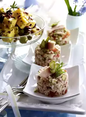 Arrange trout mince on plates and garnish with trout strips, gherkins and ##Dill##. Arrange cheese salad in a bowl and garnish with rosemary.