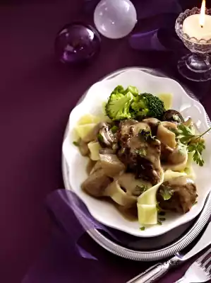 Heat the oil in a frying pan. Sauté the meat in it in portions. Season with salt and pepper and remove. Heat 1 tbsp. truffle butter in the frying fat, fry the mushrooms and shallots in it. Season with salt and pepper.