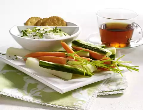 Season to taste with salt and pepper. Wash the carrots and peel them so that some green remains. Peel, wash and cut the kohlrabi into finger-thick sticks. Arrange the vegetable sticks on a plate.