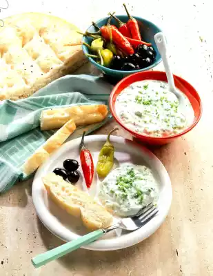 Mix yoghurt with garlic, cucumber and chives and season with salt and pepper. Serve with red and green peppers, black olives and flat bread.