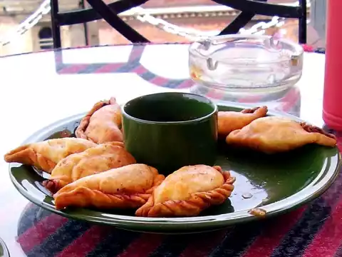 Moisten the edges of the dough with some water. Fold the other half of the dough over the filling to form half moons. Press the edges of the dough together with a fork.