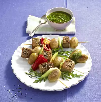 Put potatoes, bell peppers, spring onions and tuna alternately on 8 skewers. Sprinkle tuna pieces with sesame seeds. Heat the oil in a pan and fry the skewers for about 5 minutes until golden brown all around. Arrange on plates. Add remaining potatoes and sprinkle with pesto. Garnish with rocket. Add the rest of the pesto
