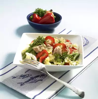 Peel the onion and cut into strips. Season vinegar and 2 tablespoons of water with salt, pepper and sugar, stir in oil. Mix beans, paprika, onion and noodles, pour vinaigrette over. Drain the tuna, pluck it into pieces.