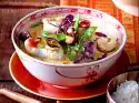 Peel the mango and cut the flesh into slices from the stone. Cut the avocado in half and remove the flesh. Finely dice mango, avocado and tuna, mix loosely. Mix soy sauce, 5 tbsp. water, chilli sauce, sesame oil and lime juice, drizzle over the mixture.