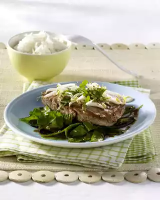 Fry the sugar snap peas in the frying fat for approx. 1 minute, turning. Add soy sauce and 4 tablespoons of water. Bring to the boil and stew in a closed pan for approx. 4 minutes. Arrange sugar snap peas, fish and soya bean sprouts on a plate anric