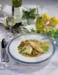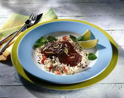 Wash the tomato, quarter it, remove the seeds and cut into small cubes. Arrange fish and rice on plates. Sprinkle rice with tomato cubes. Sprinkle fish with lemongrass strips and grated lime zest to taste and serve garnished with lime wedges and lemon balm.