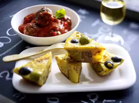 Sauté the potatoes in it. Add onion and fry briefly. Add olives and tuna. Pour eggs on top and let everything simmer for about 20 minutes at low heat. Carefully remove the tortilla from the edge of the pan, let it slide out of the pan and cut it into pieces.