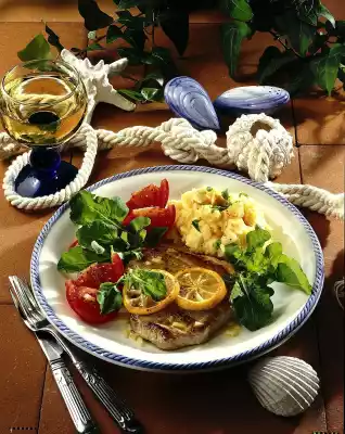Peel the garlic. Cut half into slices. Wash the tuna and pat dry. Heat 1/2 tsp. oil in a coated pan. Fry the fish for 2-3 minutes on each side. Season with salt, pepper and lemon juice. Fry the garlic and lemon slices with the fish