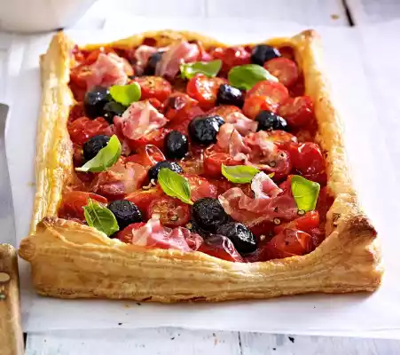 Place the puff pastry with baking paper on a baking tray. Spread with pizza tomatoes, leaving about 2 cm of edge free. Spread tomatoes and ham on top. Season with pepper and sprinkle with vinegar and oil.