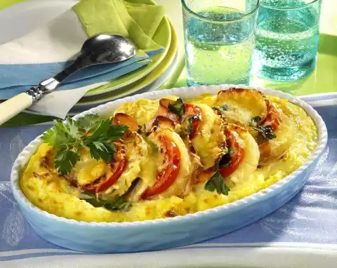 Peel, wash and quarter the potatoes. Cook in boiling salted water for about 20 minutes. Then drain, add buttermilk, crush finely and fill into an ovenproof dish. In the meantime drain the pineapple. Clean, wash and slice the tomatoes. Wash the parsley and remove the leaves.