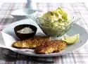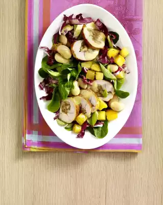 Wash the potatoes and cook in boiling water for about 20 minutes. Drain potatoes, rinse and peel. Heat 2 tablespoons of oil in a pan. Brown the meat all around and continue to fry over a low heat for about 12 minutes. Wash the salad mix and spin dry.