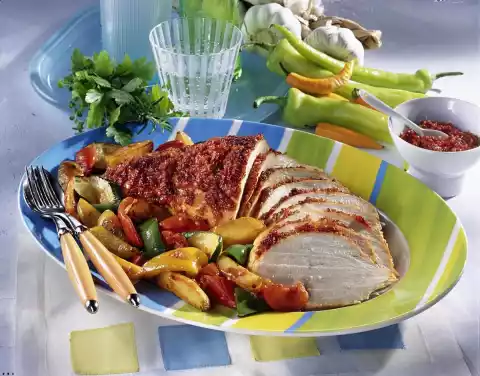 Season with salt and pepper. After about 30 minutes cooking time, coat the roast several times all around with chilli paste. Scrub and quarter the potatoes. Clean, wash and roughly cut the peppers into pieces.