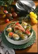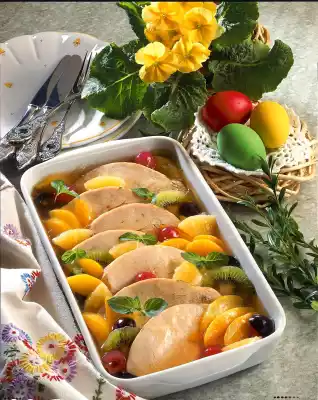 Wash the meat, dab dry and rub with salt, pepper and herbs. Place on the fat pan of the oven and roast in the preheated oven (electric: 200°C/ gas: level 3) for about 40 minutes. Drain pineapple and peaches on a sieve and collect the juice. Mix stock and 6 tablespoons of juice and pour it over the meat several times. Take out the turkey breast and let it cool down. Soak the gelatine in cold water. Pour roast stock through a sieve, fill up to 1/2 litre of liquid with juice and water and bring to the boil. Squeeze the gelatine, dissolve in the stock and allow to cool. Peel, halve and slice the kiwi. Wash and halve the grapes. Cut cocktail cherries in half. Cut pineapple into pieces, peaches into thin slices and turkey breast into slices. Put turkey breast in a mould and cover with 1/3 of the fruit. Pour liquid over it and let it set in the fridge. Garnish with mint leaves. Add the remaining fruit separately