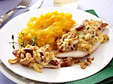 Roughly chop the nuts. Grate cheese. Crumble bread in the universal chopper. Wash thyme, shake dry, remove leaves. Save some thyme leaves for garnishing, chop the rest finely.