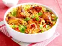 Bake for another 15-20 minutes. For the vegetables, clean, wash and chop the peppers and celery. Peel shallots and halve if necessary. Fry the vegetables and shallots in the remaining oil. Pour on the stock and cook for 10-15 minutes.
