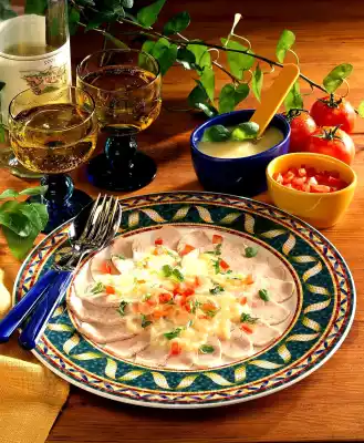 Drain the potatoes and press them through a potato ricer or mash them finely with a fork. Mix with vinegar. Season with salt and pepper. Stir in oil and 100 millilitres of chicken stock. Cut meat into very thin slices and arrange on a plate.