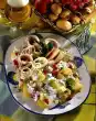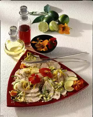 Cut the meat into thin slices. Distribute on four flat plates. Add zucchini and walnuts. Pour the marinade over them and garnish with slices of lime and nasturtium flowers.