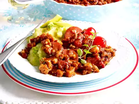 Heat the oil in a pan. Sauté the meat for about 5 minutes. Fry the onion for about 2 minutes. Season with salt and pepper. Stir in tomato paste and sauté briefly. Stir in 100 ml water and barbecue sauce.