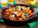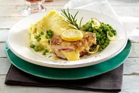 Peel and chop the potatoes and boil them in salted water for about 20 minutes. Wash the cutlets, dab dry and cut one pocket each. Fill with 1 slice of cheese and 2 slices of salami. Whisk eggs. Mix rosemary with breadcrumbs and almonds. Season schnitzel with salt and pepper. First turn in flour, then in egg and finally in the breadcrumb mixture. Heat clarified butter in a large pan. Fry the schnitzels for about 5 minutes on each side until golden brown.