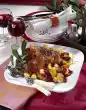 Add apple pieces, chilli and coconut milk, simmer for another 10 minutes. Roast the coconut chips in a pan without fat for a short time, take them out. Sprinkle the sauce thickener into the goulash, bring to the boil briefly. Wash the chives and cut into small rolls. Season goulash to taste again. Sprinkle with chives and coconut chips. Serve garnished with apple halves