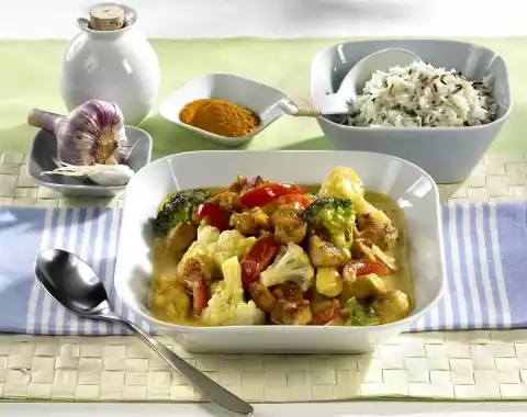Sprinkle with curry, toast while stirring and deglaze with stock. Add cauliflower and broccoli, bring to the boil, cover and simmer for 8-10 minutes. In the meantime, put rice in 400 ml boiling salted water, cover and let it swell for about 20 minutes at low heat.