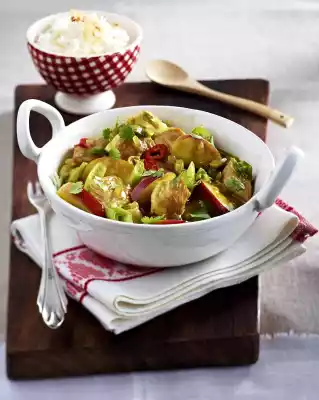 Prepare rice in boiling salted water according to package instructions. Fry meat in 2-3 portions in clarified butter, season with curry, ginger, salt and pepper. Put meat back into the roaster. Add apple juice and 500 ml water and bring to the boil. Cover and braise over medium heat for about 5 minutes