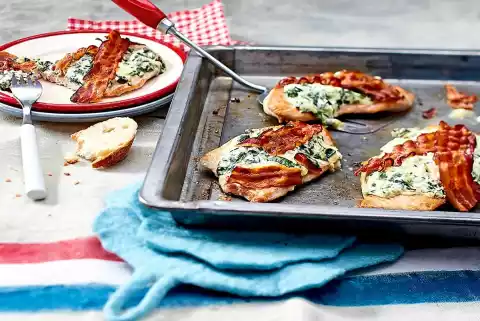Place the cutlets next to each other on the tray. First spread the cheese-spinach mixture, then the bacon on top. Bake in a hot oven for 5-8 minutes. Delicious with baguette.