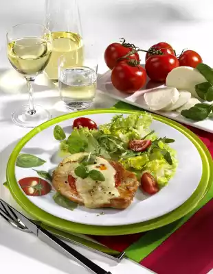 Place the meat on a baking tray lined with baking paper, cover with tomato slices and mozzarella. Bake in the preheated oven (electric cooker: 200 °C/ convection oven: 175 °C/ gas: level 3) for 10-12 minutes.