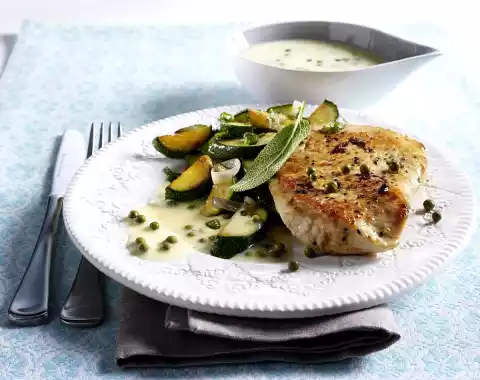 Wash the meat, dab dry. Season with salt and pepper. Heat oil in a coated pan, fry meat for 5-7 minutes, turning. Take out and keep warm. Fry the zucchini, shallots and sage in the cooking fat for 3-4 minutes over medium heat.