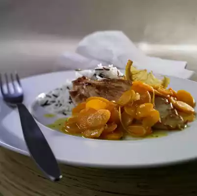 Braise the carrots in the pan for about 4 minutes. After 2 minutes add lemon juice, stock and peel. Season to taste with salt and pepper. Arrange rice, vegetables and turkey steaks on plates. Garnish with lemon wedges.