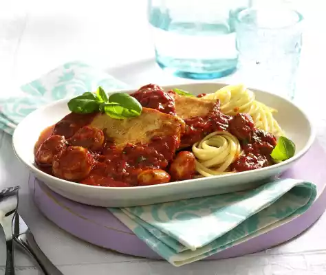Fry the mushrooms and diced onion for about 3 minutes, then add the tomato sauce. Simmer the sauce for 6-8 minutes. Drain the pasta. Add the schnitzel to the sauce after about 2 minutes. Wash the basil and dab dry. Arrange noodles with schnitzel and tomato sauce and garnish with basil leaves
