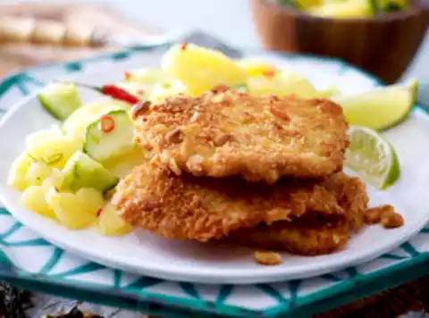 Then pull through the eggs, let them drip off a little. Finally turn in the pancreatic mixture, press lightly.
