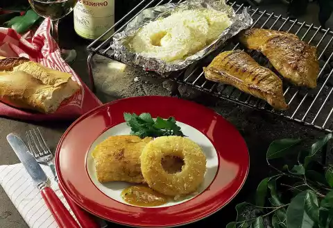 Wash the turkey escalopes and dab them dry. Drain the pineapple and turn it into the grated coconut. Place on a piece of aluminium foil and spread the butter in flakes on top. Fry the meat and pineapple rings on the preheated grill for about 5 minutes on each side.
