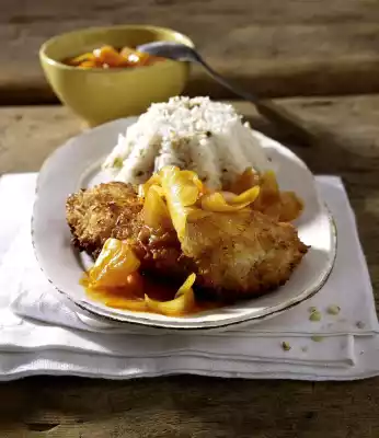 Fry the escalopes for 8-10 minutes at medium heat, turning them over. Drain the rice and mix with the cashew nuts. Press 1/4 of the mixture into each mould and turn out onto a plate. Arrange the cutlets with 1 slice of pineapple and curry sauce on each plate.